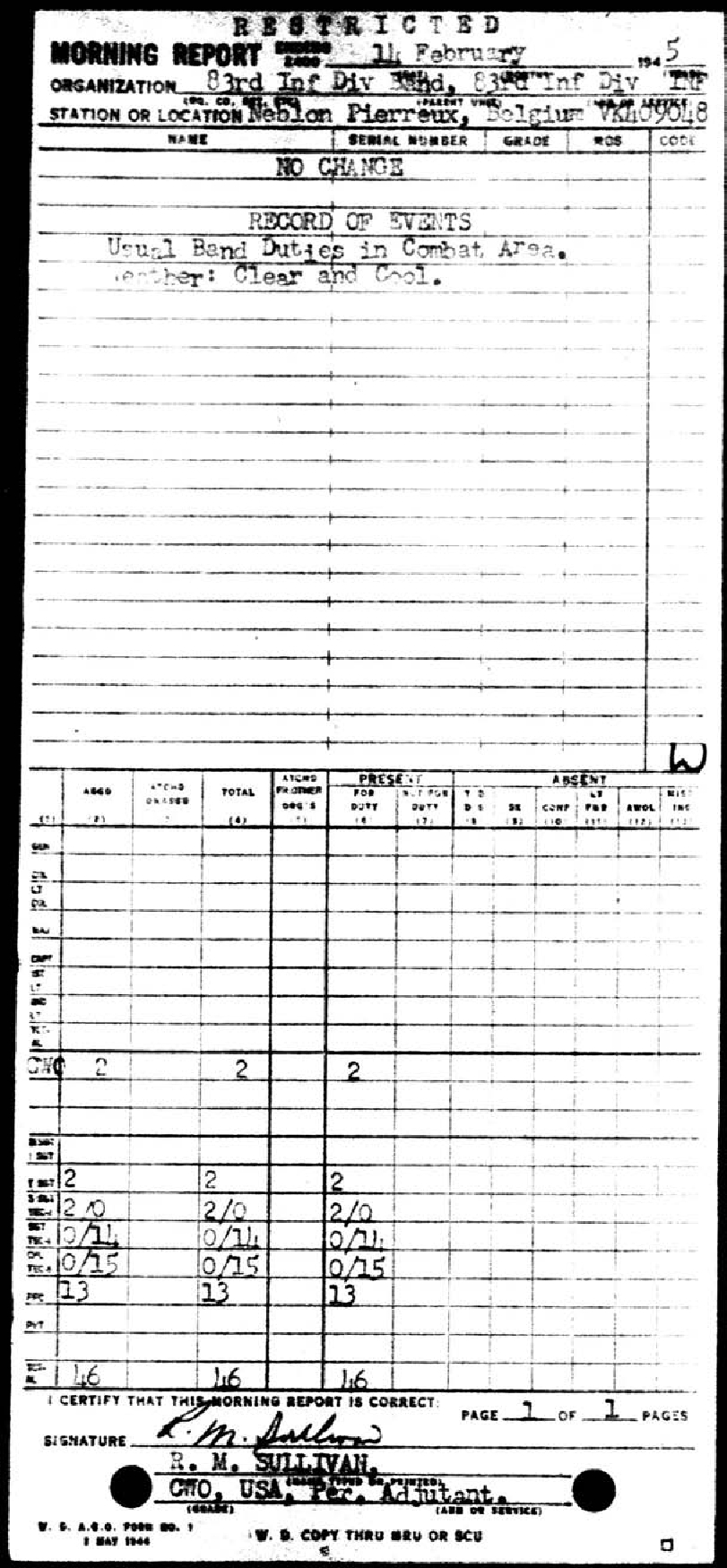 Morning report BAND/83 for February 14, 1945