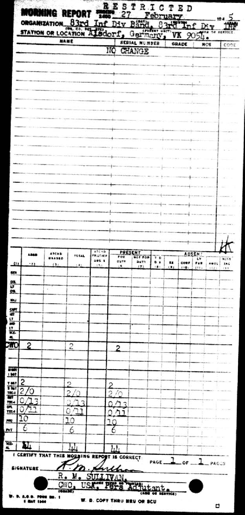 Morning report BAND/83 for February 27, 1945
