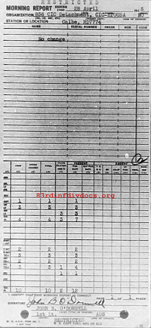 Morning report CIC/83 for April 28, 1945
