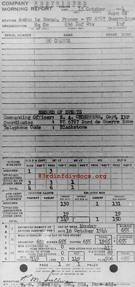 Commanding Offiicer: E.A. Cerderberg, Capt, Inf. Coordinates: vU6787 Nord de Guerre Zone. Telephone Code: Blackstone