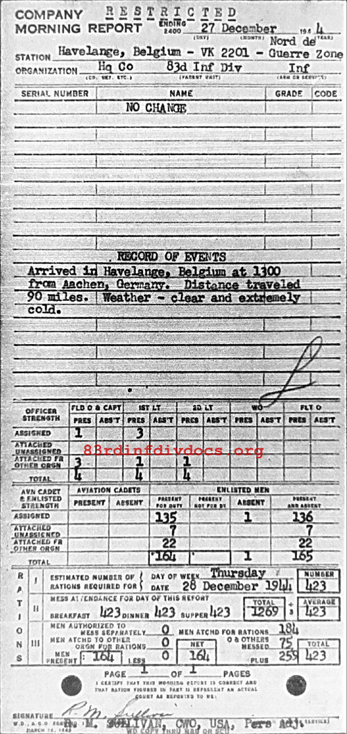 Arrived in Havelange, Belgium at 1300 from Aachen Germany. Distance traveled 90 miles. Weather: Clear and extremely cold.