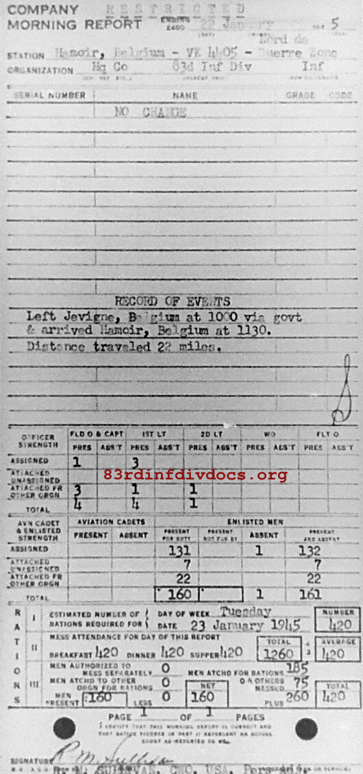 Morning report HQCO/83 for January 22, 1945