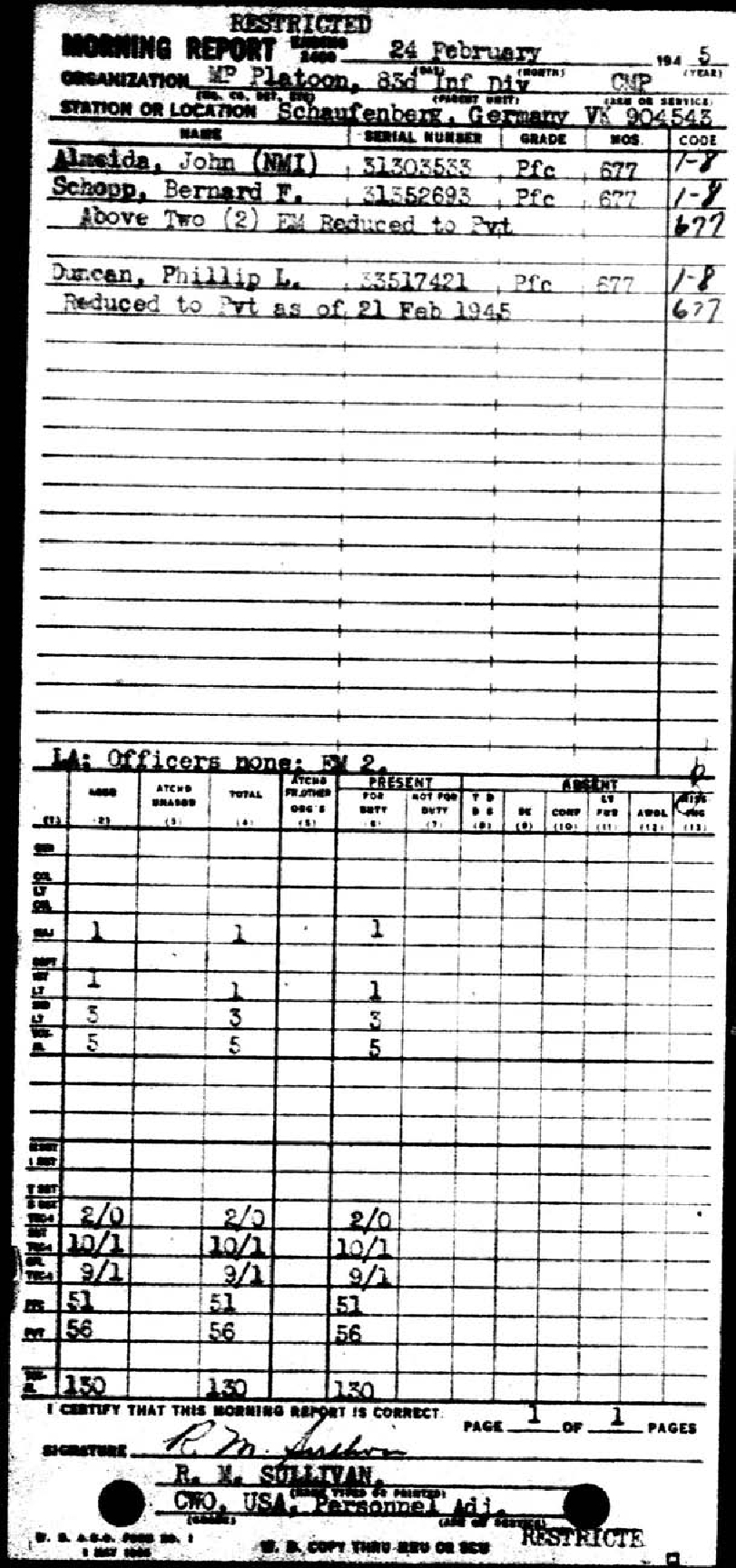 Morning report MP/83 for February 24, 1945