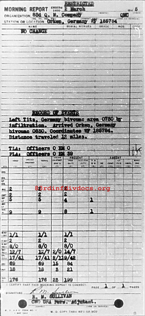 Left Titz, Germany bivouac area 0730 by infiltration. Arrived Orken, Germany bivouac 0830. Distance traveled 12 miles.
