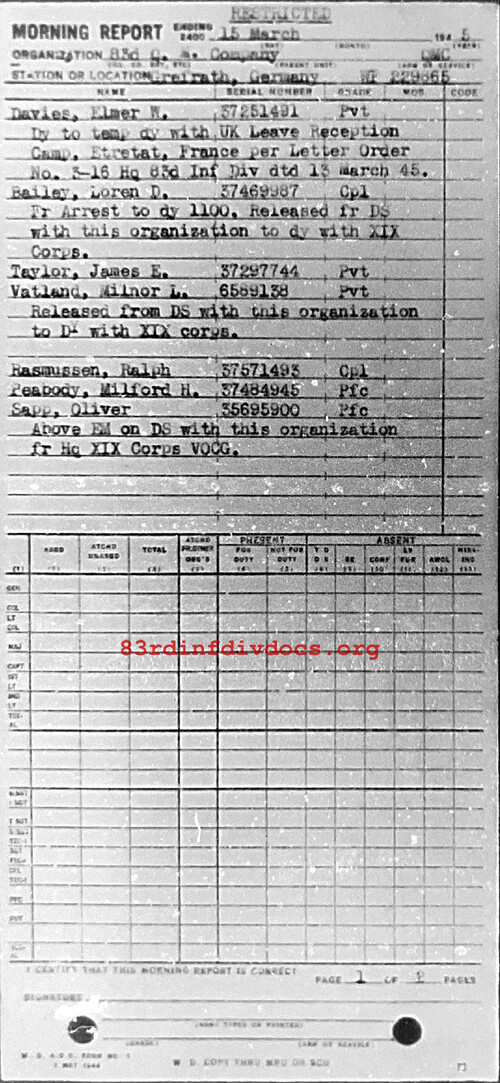 Morning report QM/83 for March 15, 1945