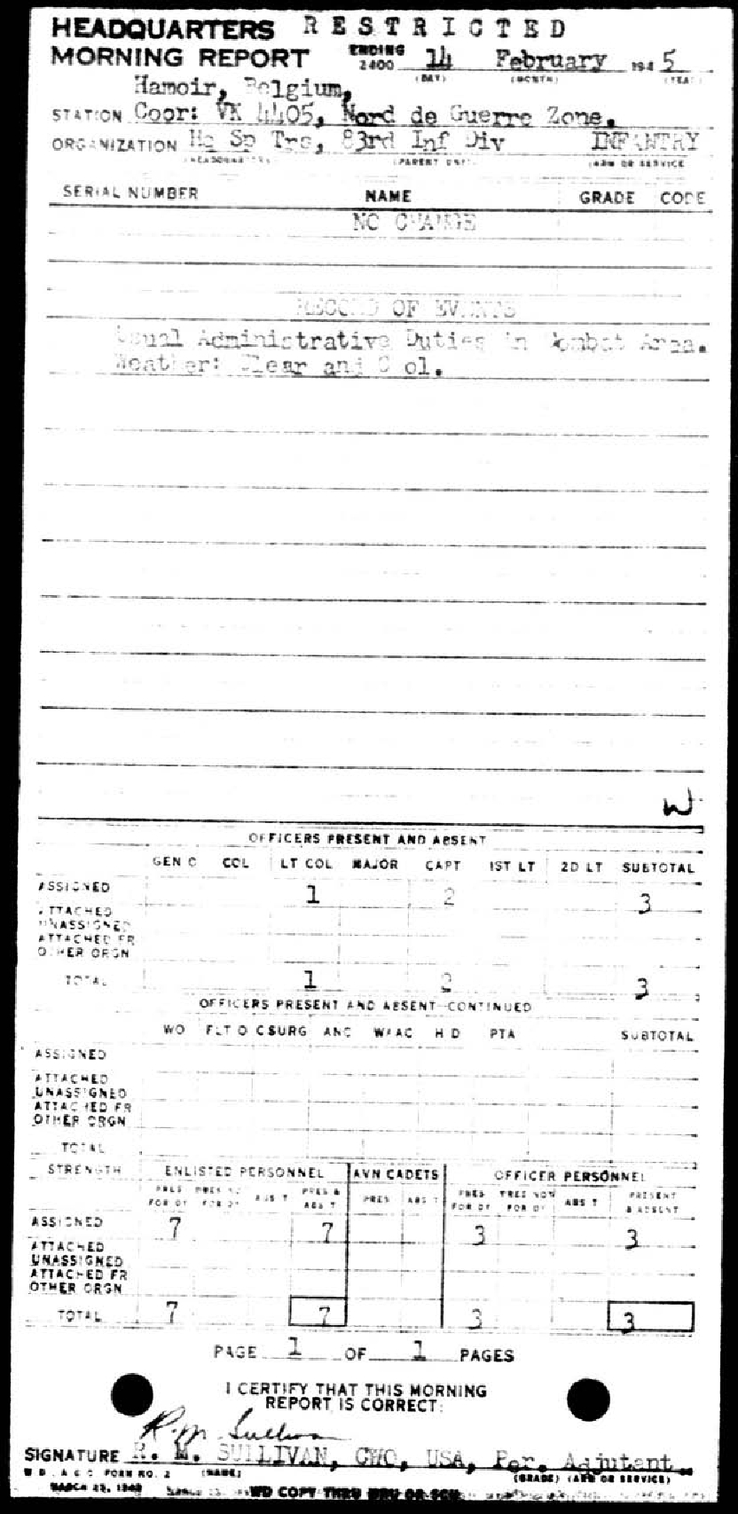 Morning report SPTRPSHQ/83 for February 14, 1945