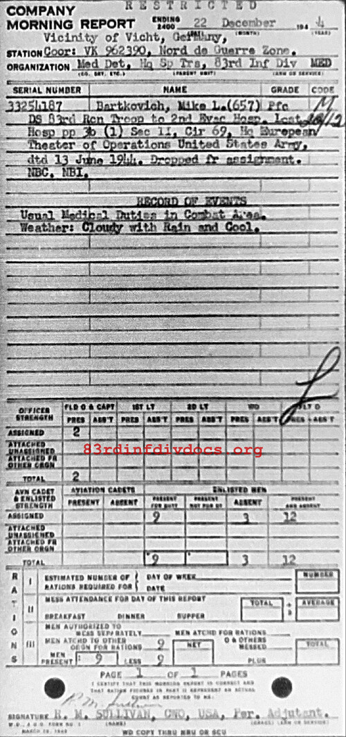 Morning report SPTRPSMEDDET/83 for December 22, 1944