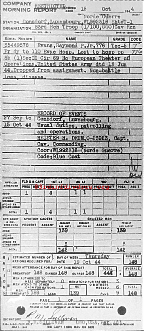 27 Sep 44 to 15 Oct 44 - Usual duties, patrolling and operations. Heister H. Drum, O-23923, Capt Cav. Commanding. Coor: WL992316 (Norde Guerre) Code: Blue Coat