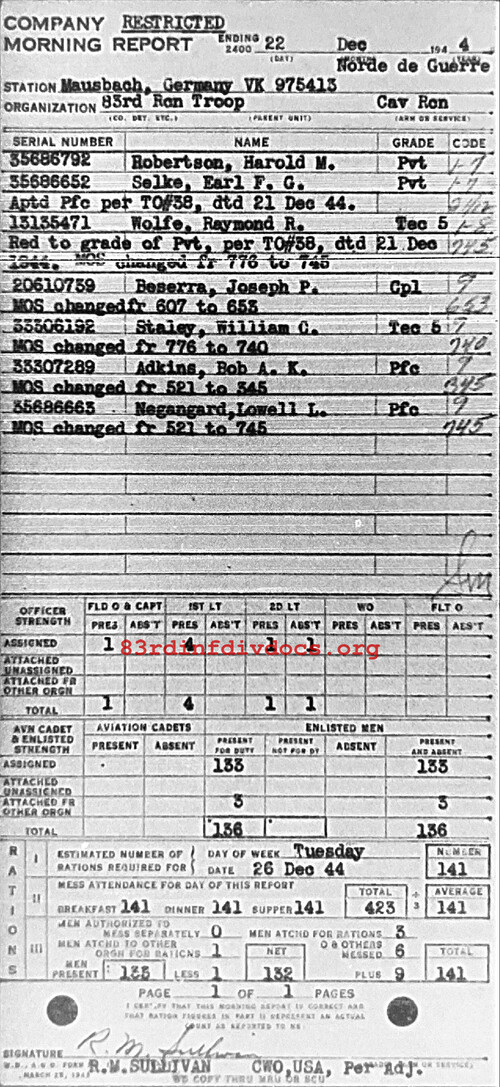 Morning report 83RCNTRP for December 22, 1944