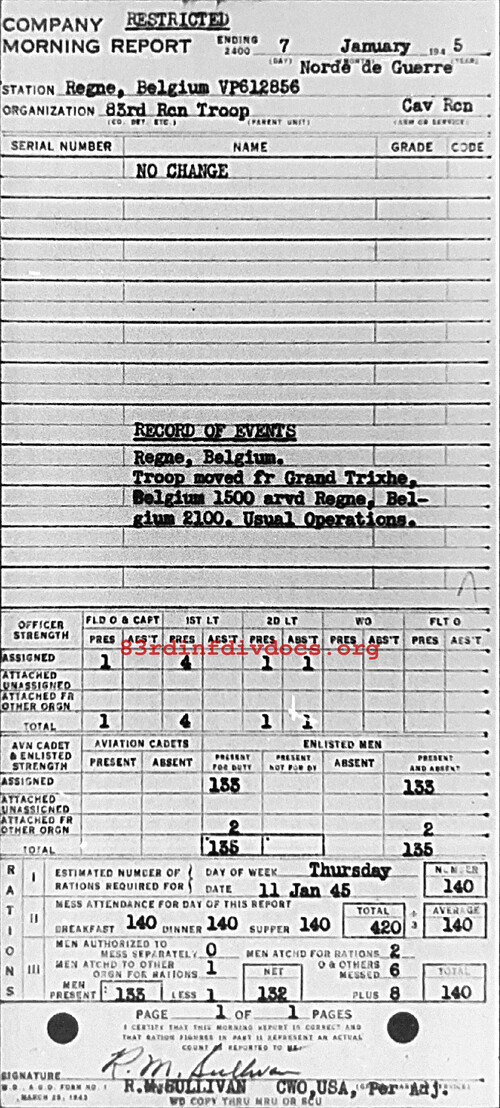 Troop moved fr Grand Trixhe, Belgium 1500 arvd Regne, Belgium 2100. Usual Operations.