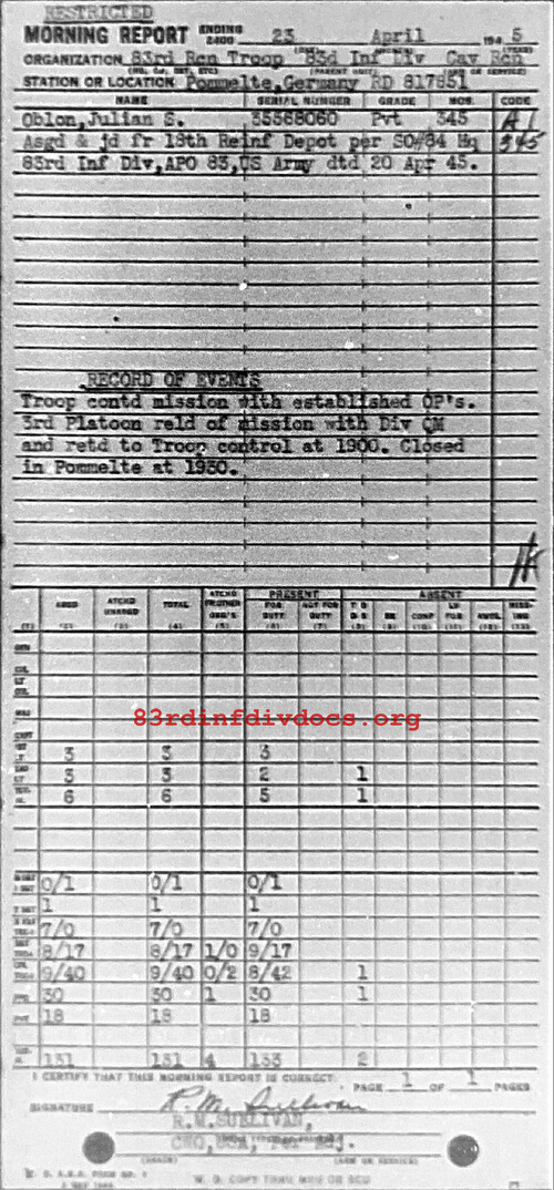 Morning report 83RCNTRP for April 23, 1945