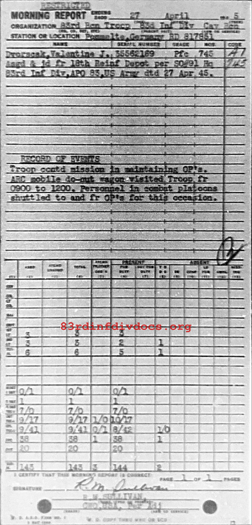 Troop contd mission in maintaining OP's. ARC mobile do-nut wagon visited Troop fr 0900 to 1200. Personnel in combat platoons shuttled to and fr OP's for this occassion.