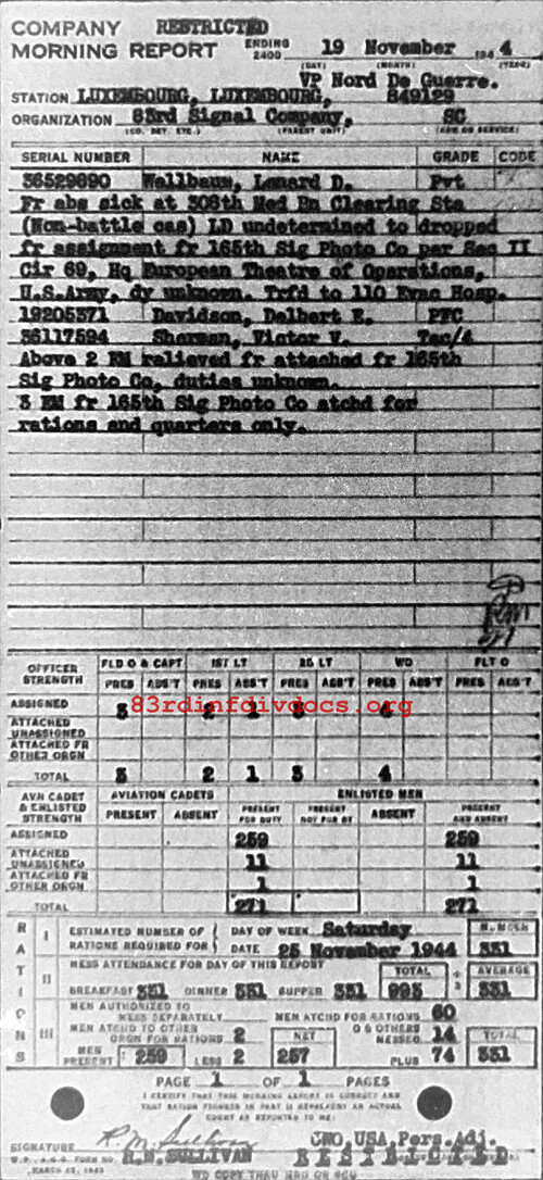 Morning report 83SIGCO for November 19, 1944