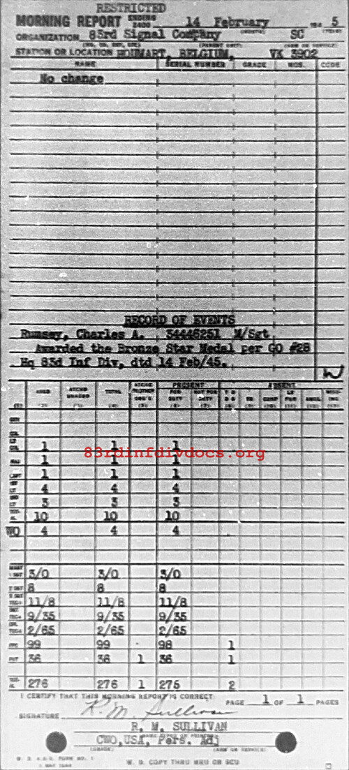 Morning report 83SIGCO for February 14, 1945