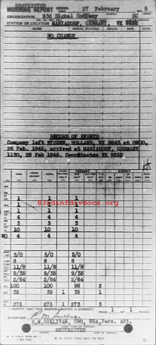 Company left Eysden, Holland, VK5643 at 0900 26 Feb 1945, arrived at Mariadorf, Germany 1130, 26 Feb 1945. Coordinates VK9252