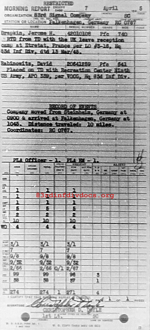 Company moved from Steinheim, Germany at 0900 and arrived at Falkenhagen, Germany at 1045. Distance traveled: 10 miles.