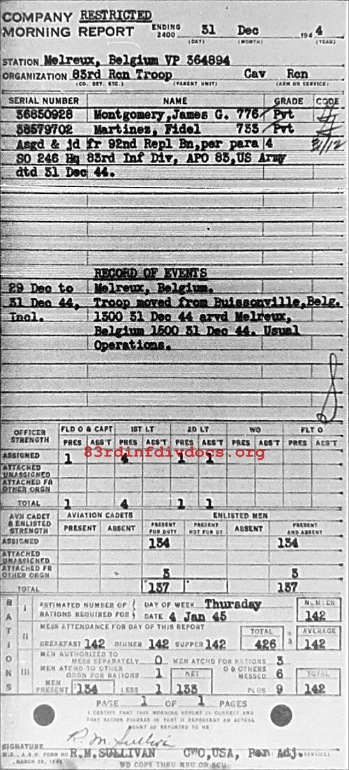 29 Dec 44 to 31 Dec 44 incl - Troop moved from Buissonville, Belgium 1300 31 Dec 44 arvd Melreux, Belgium 1500 31 Dec 44. Usual Operations.