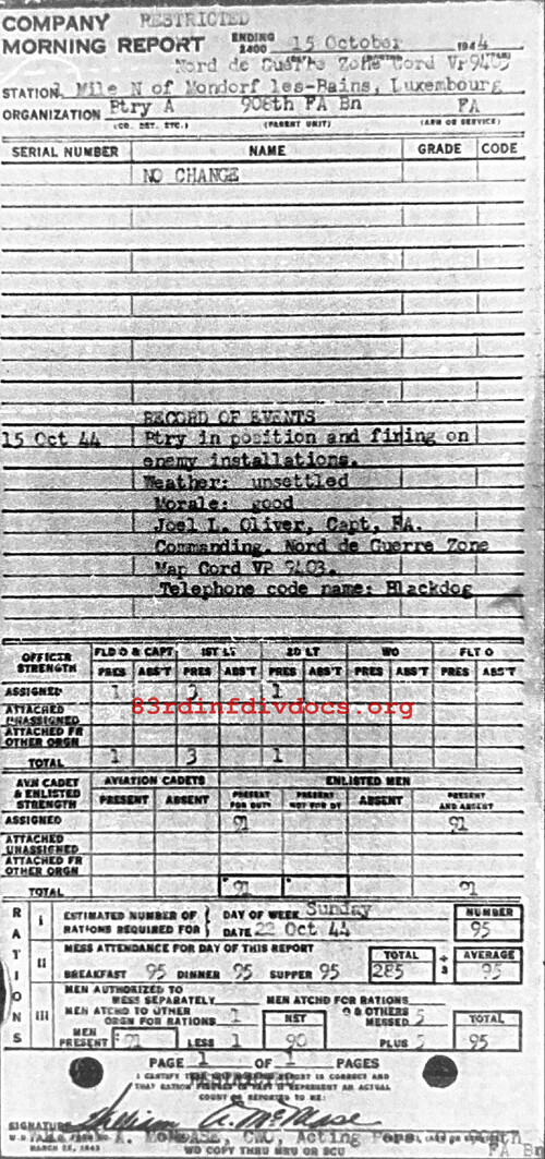 Btry in position and firing on enemy installations. Weather: Unsettled. Morale: good. Joel L. Oliver. Capt, RA. Commanding. Nord de Guerre Zone Map Cord vP9403. Telephone code name: Blackdog