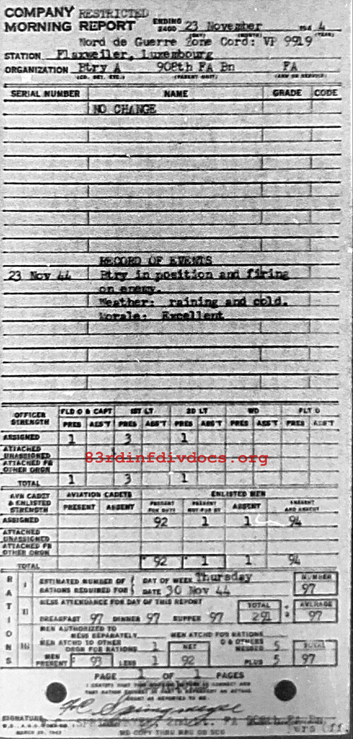 Btry in position and firing on enemy. Weather: Raining and cold. Morale: Excellent.