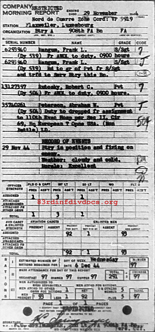 Btry in position and firing on enemy. Weather: Cloudy and cold. Morale: Excellent.