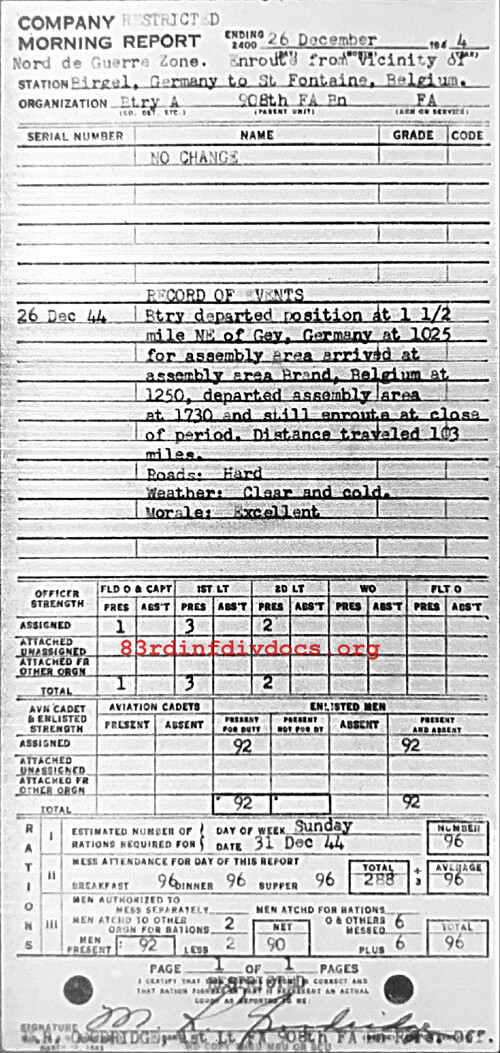 Btry departed position at 1 1/2 mile NE of Gey, Germany at 1025 for assembly area arrived at assembly area Brand, Belgium at 1250, departed assembly area at 1730 and still enroute at close of period. Distance traveled 103 miles. Roads: Hard. Weather: clear and cold. Morale: Excellent.