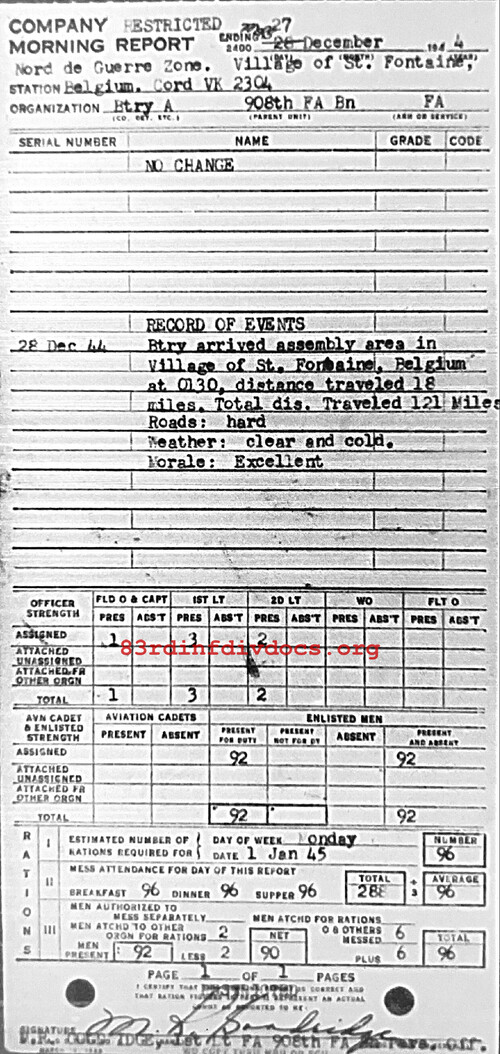 Btry arrived assembly area in Village of St. Fontaine, Belgium at 0130, distance traveled 18 miles. Total dis. Traveled 121 Miles. Roads: hard. Weather: clear and cold. Morale: Excellent.