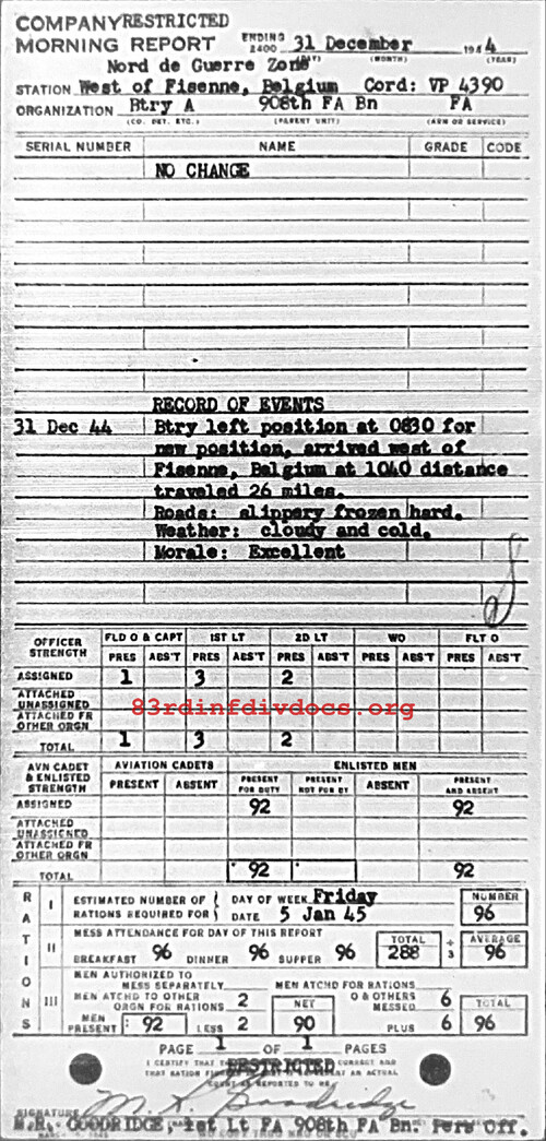 Btry left position at 0830 for new position, arrived west of Fisenne, Belgium at 1040 distance traveled 26 miles. Roads: slippery frozen hard. Weather: cloudy and cold. Morale: Excellent.