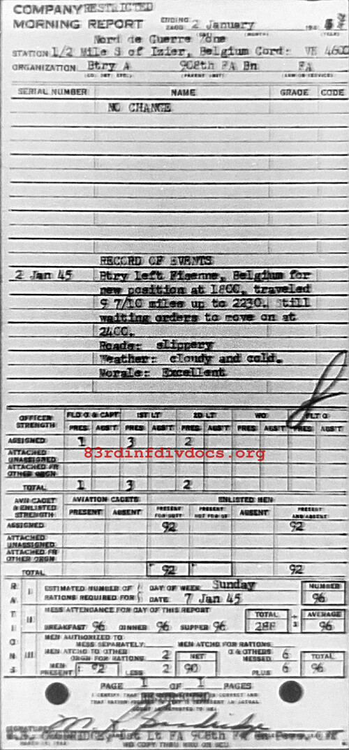 Btry left Fisenne, Belgium for new position at 1800, traveled 9 7/10 miles up to 2230. Still waiting orders to move on at 2400. Roads: Slippery. Weather: Cloudy and cold. Morale: Excellent.