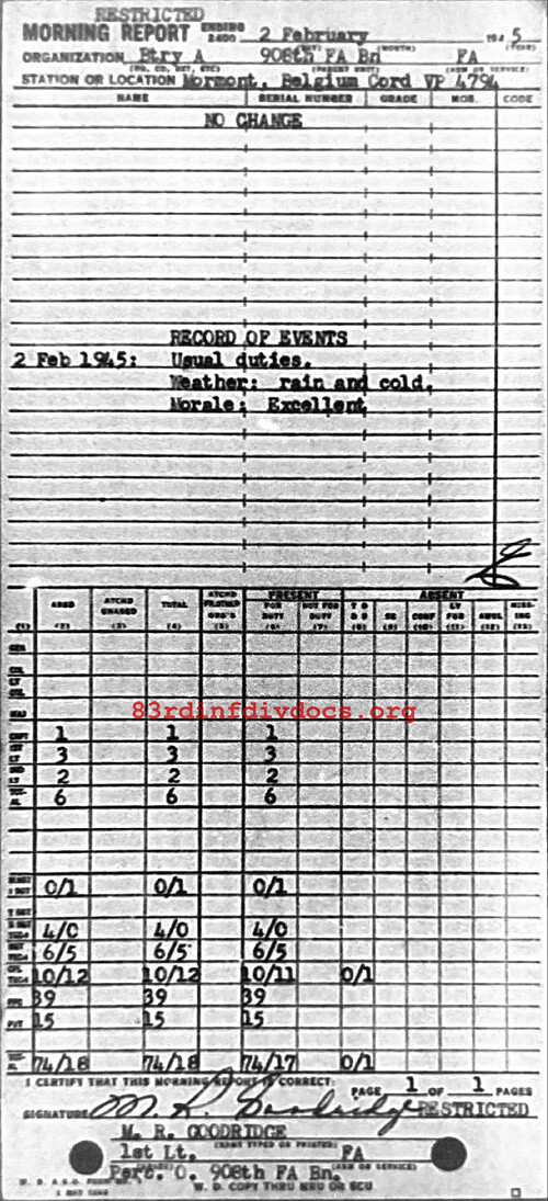 Morning report A/908FA for February 2, 1945