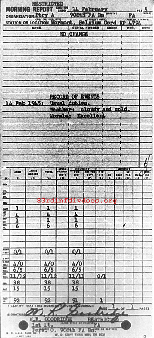 Morning report A/908FA for February 14, 1945