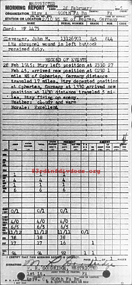 Btry left position at 2330 27 Feb 45, arrived new position at 0230 1 Mile NE of Opherten, Germany distance traveled 17 miles. Btry departed position at Opherten, Germany at 1330 arrived new position at 1430 distance traveled 5 miles. Btry firing on enemy. Weather: Cloudy and warm. Morale: Excellent.