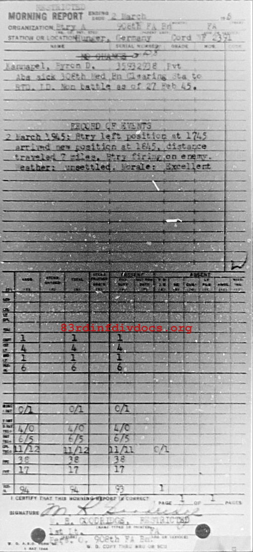 Morning report A/908FA for March 2, 1945