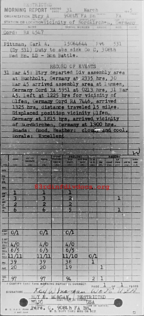 Btry departed Div assembly area at Buchholt, Germany at 2335 hrs, 30 Mar 34 arrived assembly area at Lunzen, Germany Cord rA5951 at 0213 hrs, 31 Mar 45. Left at 1225 hrs for vicinity of Olfen, Germany, Cord rA7446, arrived 1325 hrs, distance traveled 15 miles. Displaced position vicinity Olfen, Germany at 1815 hrs, arrived vicinity of Nordkirchen, Germany at 1900 hrs. Roads: Good. Weather: Cloudy and cool. Morale: Excellent.