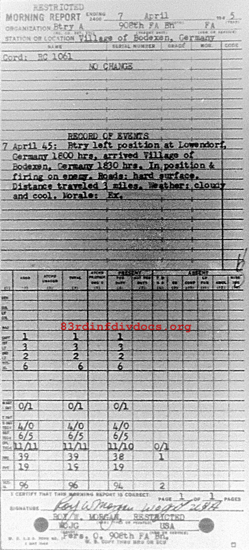 Btry left position at Lowendorf, Germany 1800 hrs, arrived Village of Boezen, Germany 1830 hrs. In position & firing on enemy. Roads: Hard surface. Distance traveled 3 miles. Weather: Cloudy and cool. Morale: Excellent.