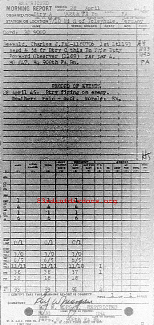 Btry in position and firing on enemy. Weather: Rain and cool. Morale: Excellent.