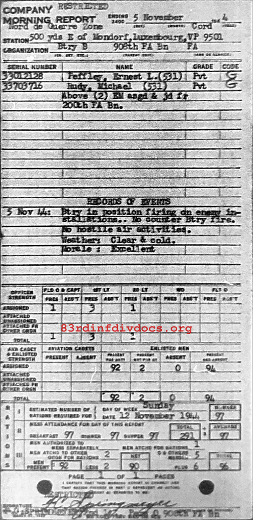 Btry in position firing on enemy installations. No counter Btry fire. No hostile air activities. Weather: Cold and clear. Morale: Excellent.