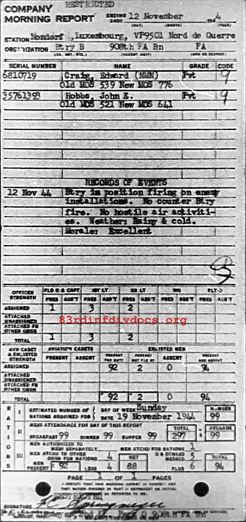 Btry in position firing on enemy installations. No counter Btry fire. No hostile air activities. Weather: Rainy and cold. Morale: Excellent.