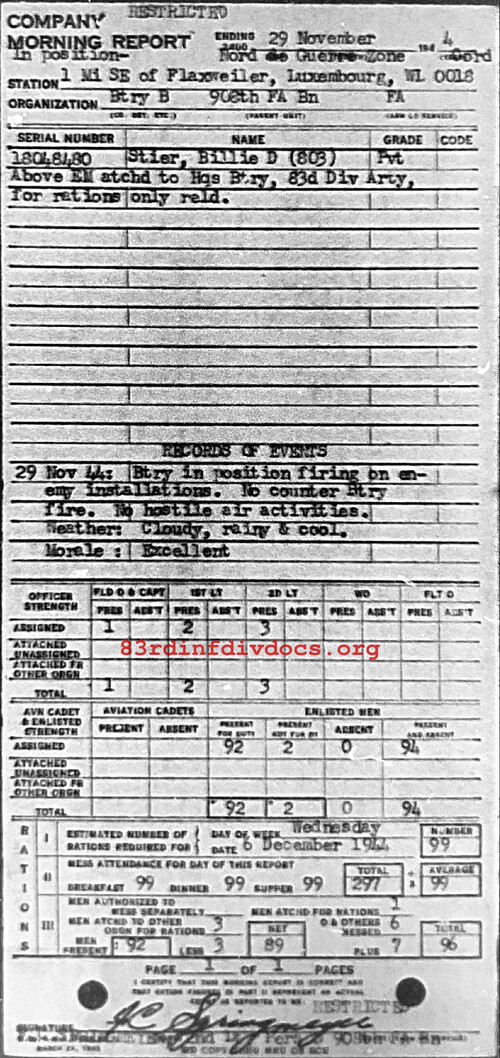 Btry in position firing on enemy installations. No counter Btry fire. No hostile air activities. Weather: Cloudy, rainy & cool. Morale: Excellent.
