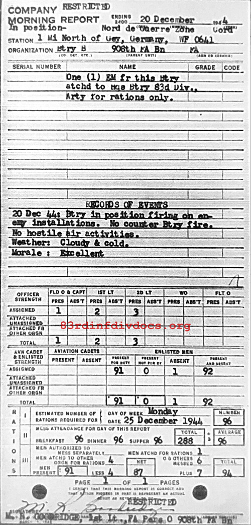 Btry in position firing on enemy installations. No counter Btry fire. No hostile air activities. Weather: Cloudy & cold. Morale: Excellent.