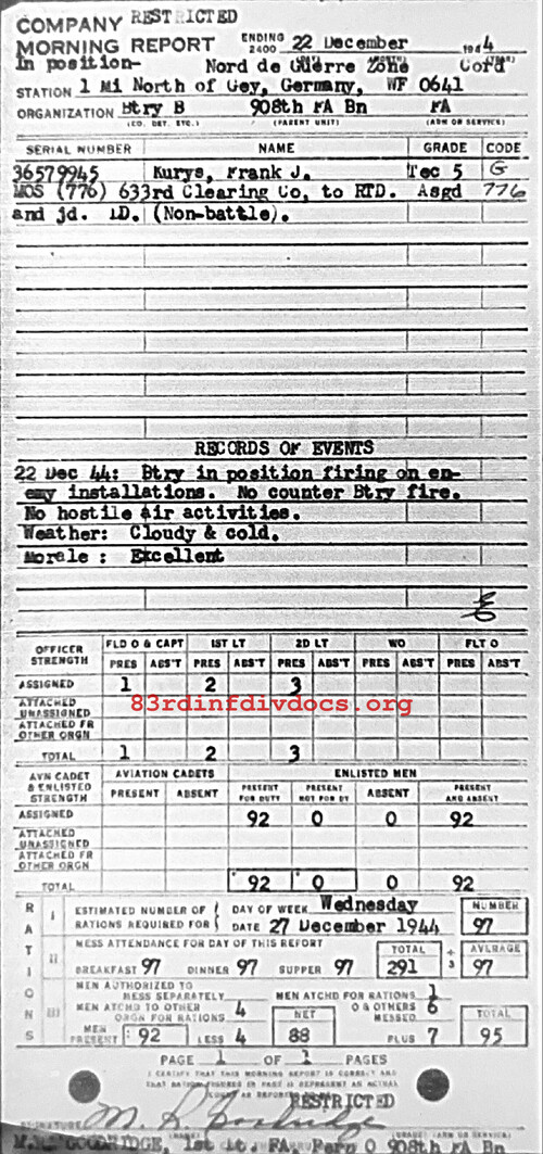 Btry in position firing on enemy installations. No counter Btry fire. No hostile air activities. Weather: Cloudy & cold. Morale: Excellent.