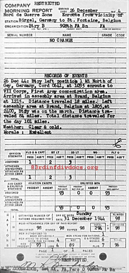 Btry left position 1 Mi North of Gey, Germany, Cord 0641, at 1035 enroute to VII Corps, First Army concentration area. Arrived in assembly area at Brand, Belgium at 1215. Distance traveled 18 miles. Left assembly area at Brand, Belgium at 1805, at 2400. Btry was on the march. Distance traveled 84 miles. Total distance traveled for the day 101 miles. Weather: Clear & cold. Morale: Excellent.
