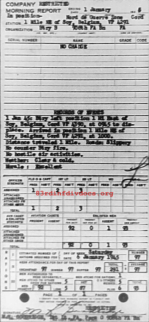 Btry left position 1 Mi East of Soy, Belgium, Cord vP4390, at 0945 to displace. Arrived in position 1 Mile NE of Soy, Belgium Cord vP4291, at 1000. Distance traveled 1 Mile. Roads: Slippery. No counter Btry fire. No hostile air activities. Weather: Clear and cold. Morale: Excellent.