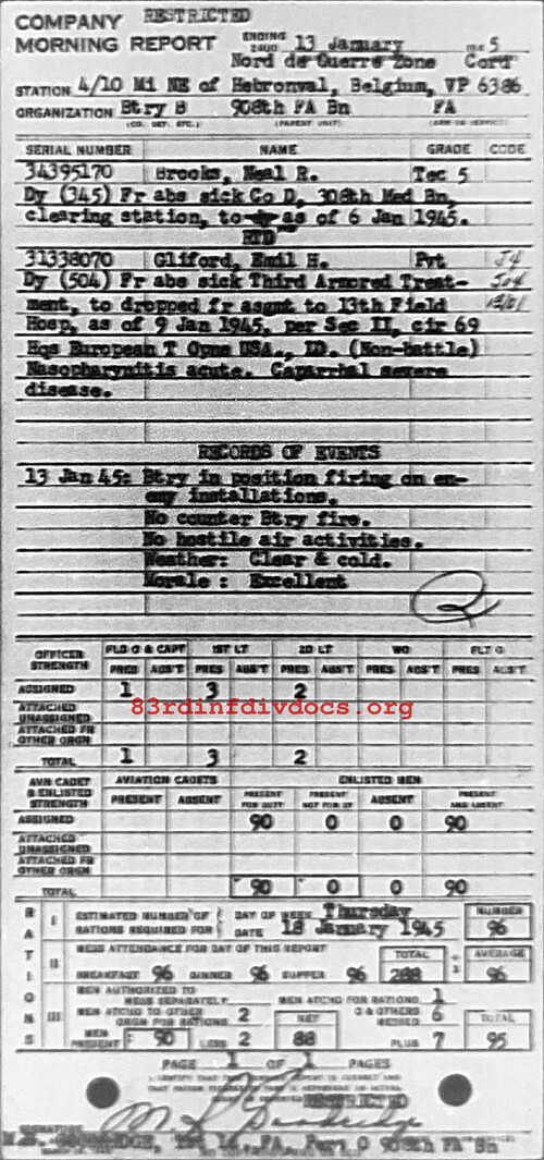 Morning report B/908FA for January 13, 1945