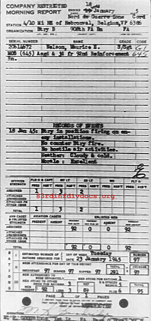Btry in position firing on enemy installations. No counter Btry fire. No hostile air activities. Weather: Cloudy & cold. Morale: Excellent.