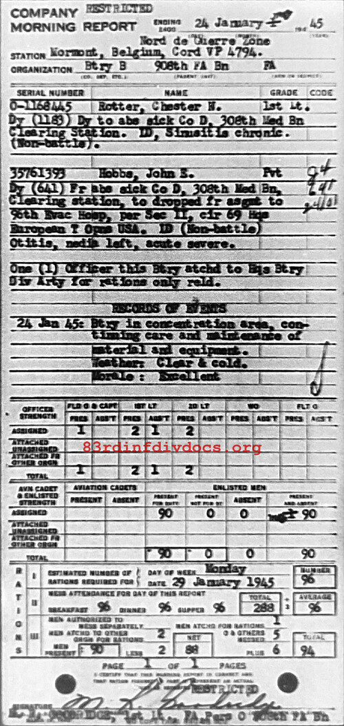 Btry in concentration area, continuing care of maintenance of material and equipment. Weather: Clear & cold. Morale: Excellent.