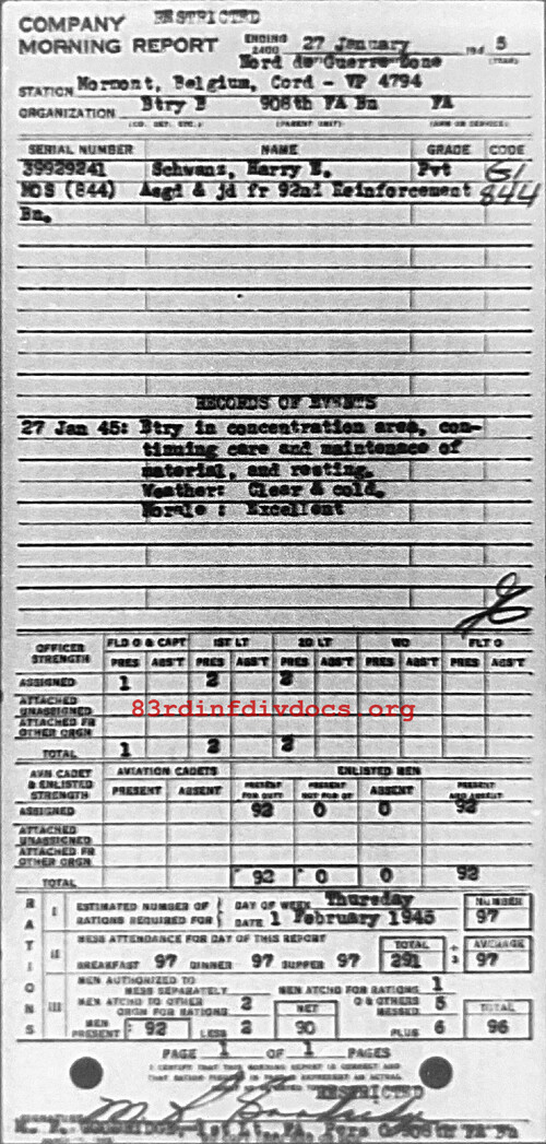 Morning report B/908FA for January 27, 1945