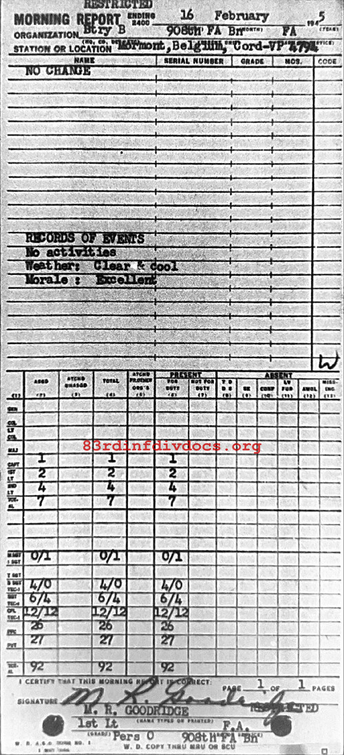 Morning report B/908FA for February 16, 1945