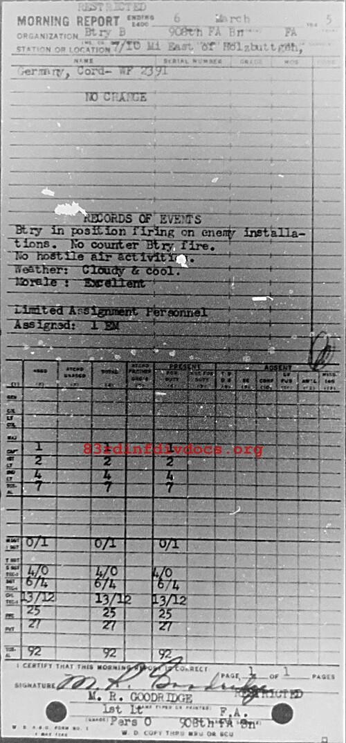 Btry in position firing on enemy installations. No counter Btry fire. No hostile air activities. Weather: Cloudy & cool. Morale: Excellent.