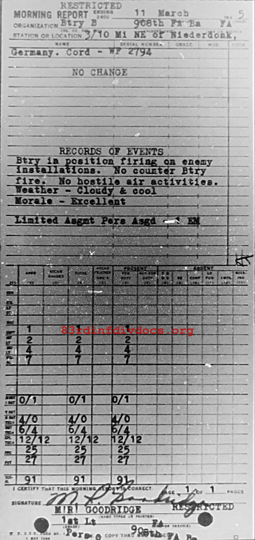 Btry in position firing on enemy installations. No counter Btry fire. No hostile air activities. Weather: Cloudy & cool. Morale: Excellent.