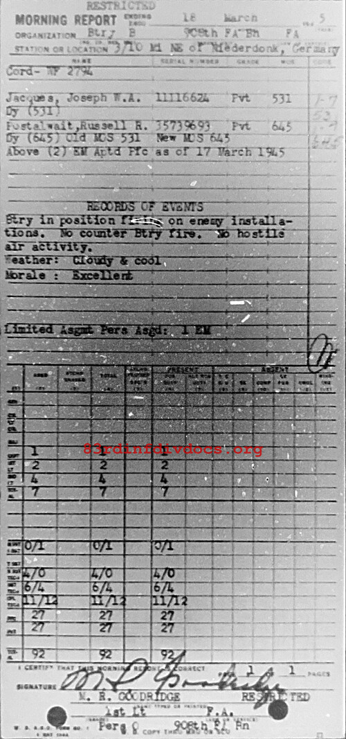 Morning report B/908FA for March 18, 1945